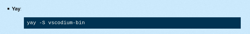 sudo yay -S vscodiumBut there are no such package! I guess it should be vscodium-bin.