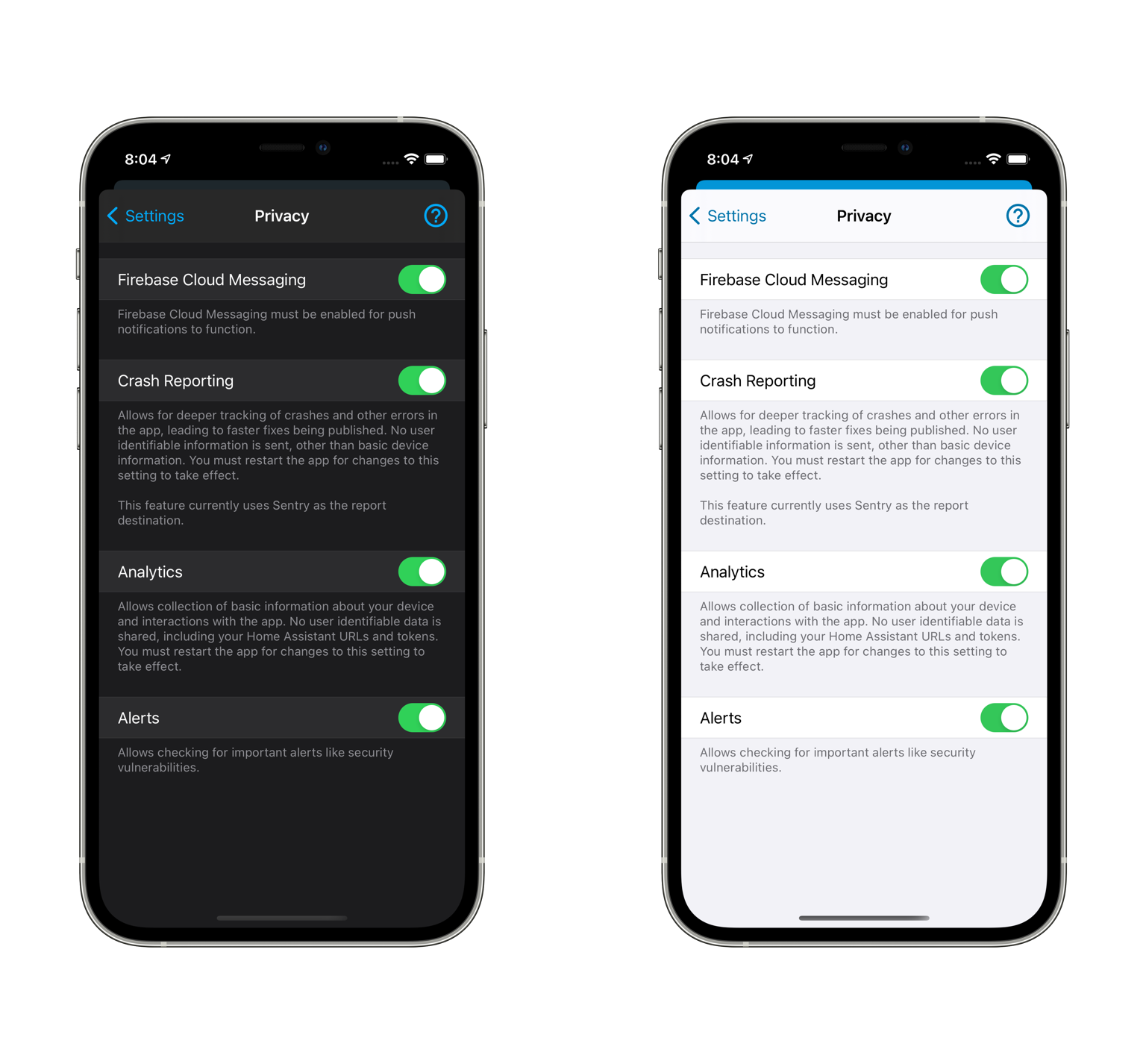 - Users who have changed _any_ privacy setting have all of the values persisted, but users who have never done so will now find crash reporting and analytics disabled.