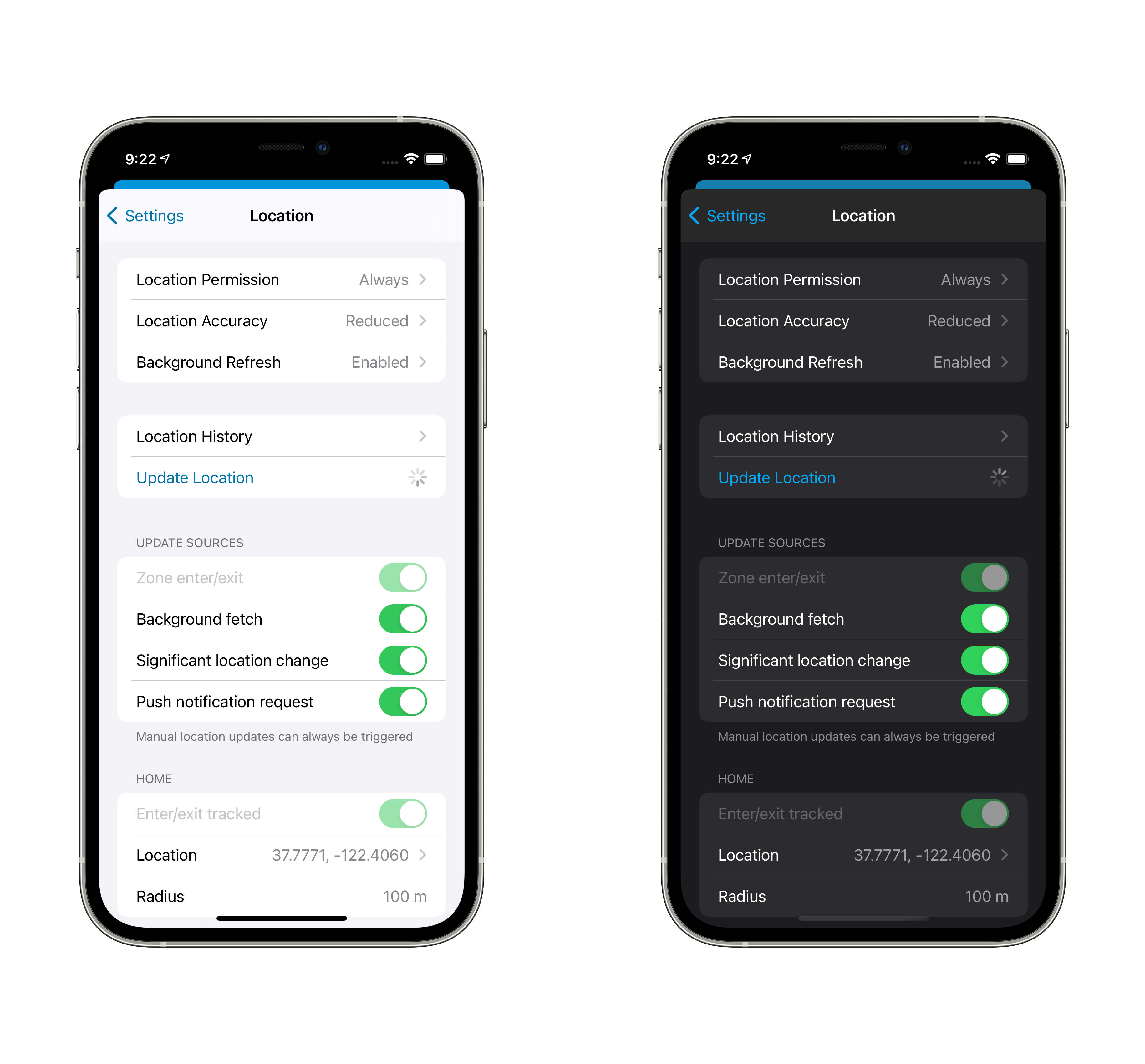 - Fills in internal & external URL, sets active SSID if possible after location permission.