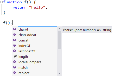 To benefit from this inference, a programmer can use the TypeScript language service. For example, a code editor can incorporate the TypeScript language service and use the service to find the members of a string object as in the following screenshot.